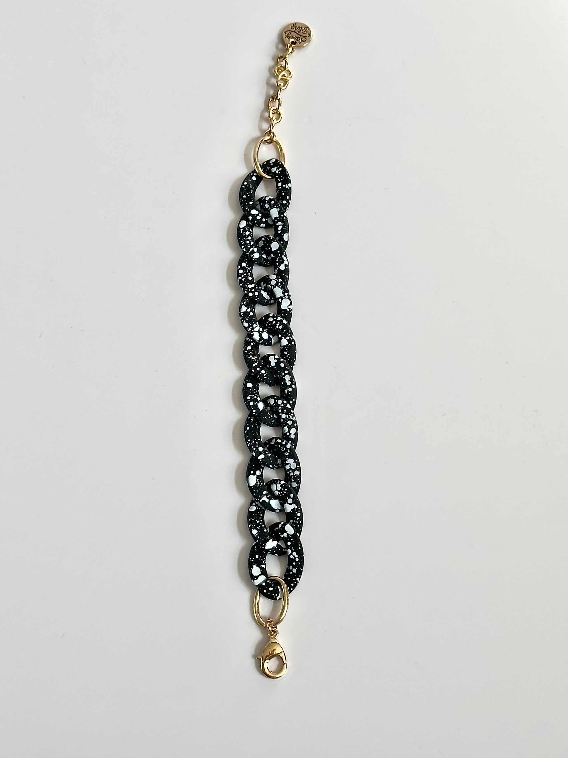 This bold acrylic link bracelet measures 7” with a 1.5” delicate gold chain extension and a lobster clasp for easy wear. The flat, chunky links add a fun pop to any outfit, finishing at 8.5” long and half an inch wide—perfect for mixing and matching in your collection.