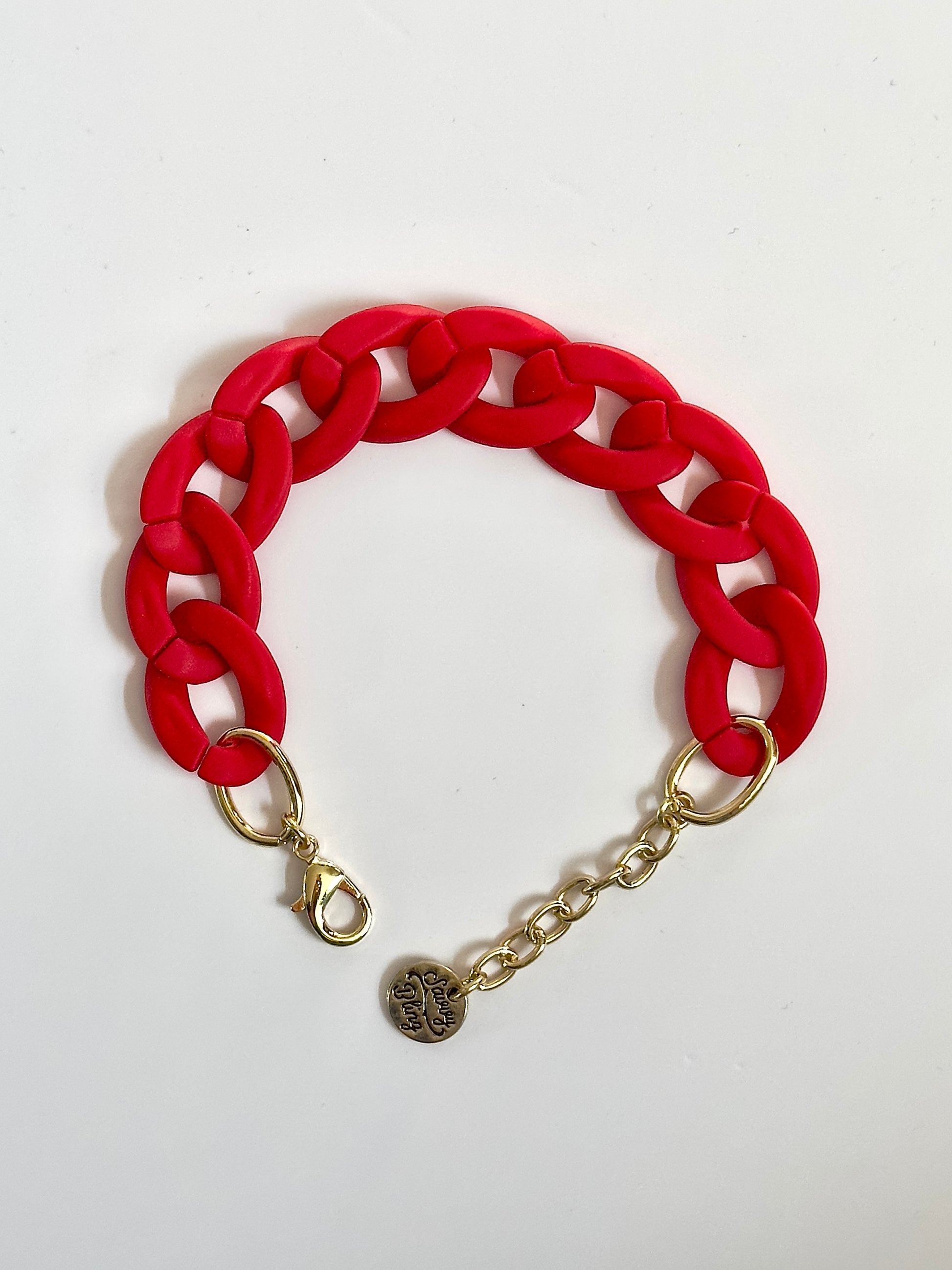 This bold acrylic link bracelet measures 7” with a 1.5” delicate gold chain extension and a lobster clasp for easy wear. The flat, chunky links add a fun pop to any outfit, finishing at 8.5” long and half an inch wide—perfect for mixing and matching in your collection.