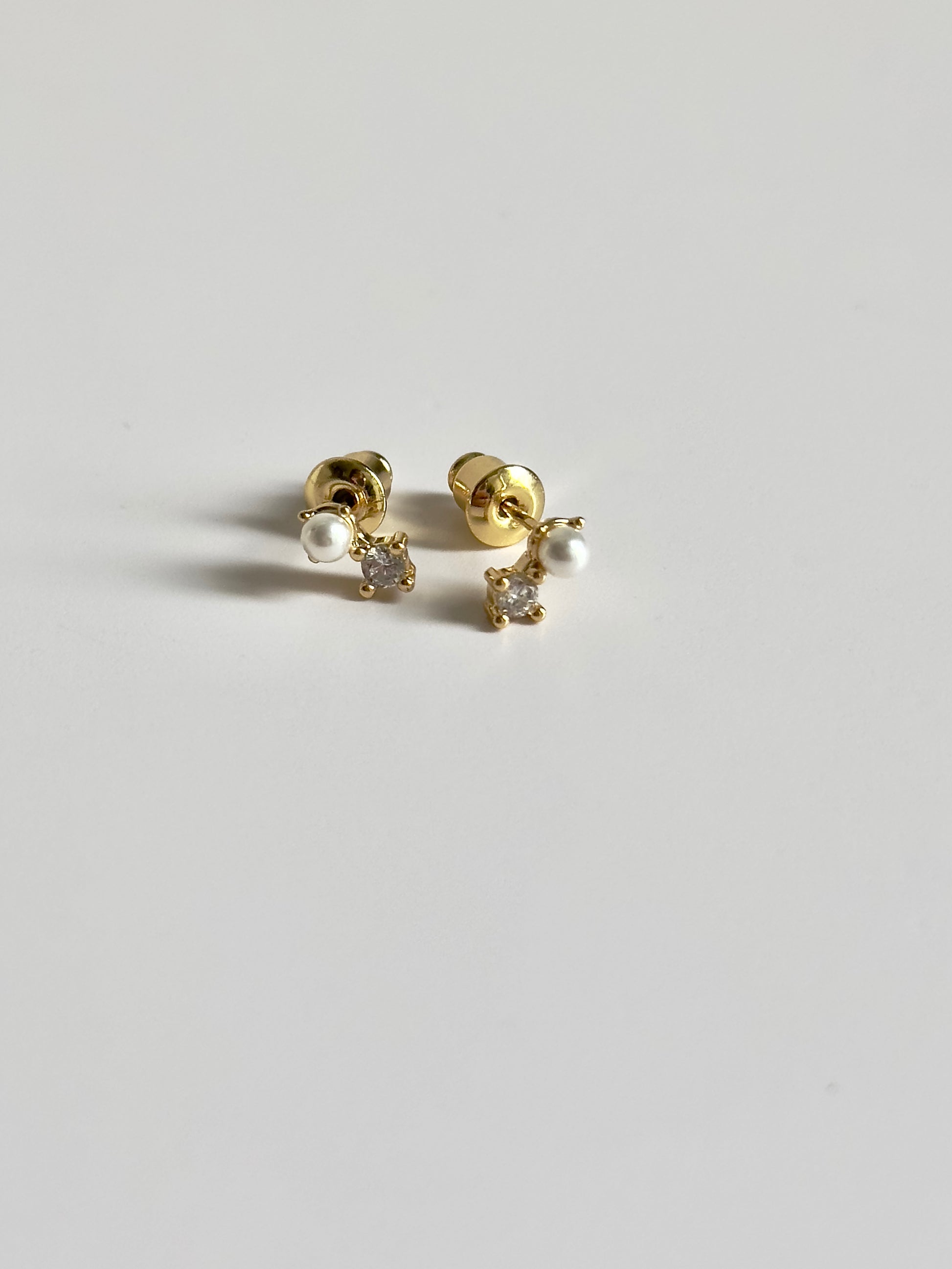 ONLY 1 PAIR LEFT! Delicate 4mm pearl studs adorned with sparkling cubic zirconia accents, crafted from 18k gold-plated stainless steel for enduring elegance. These timeless pieces combine lustrous pearls with refined detailing, designed to withstand daily wear while maintaining their sophisticated allure.